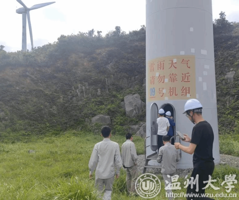 西湾风力发电场负责人导师带领同学们参观了厂内布局,并介绍发电场概况。平阳西湾风电场是温州市首个风电项目,安装有20台单机容量750千瓦级风电机组,配套建设一座35千伏开闭所,年设计发电量3575万千瓦时。随后,同学们参观了风力发电的相关设备,并了解了三相异步电动机、控制柜及配电装置等工作原理。在风力发电机组的塔筒参观环节,同学们深入了解了风力发电机组的叶轮、机舱、塔筒等基础部件,以及风力发电的基本原理。同学们就发电效率相关影响因素提出疑问。负责人导师为学生悉心解答,并进而讲述了风力发电的优缺点,即虽然风力发电有能源充足、不消耗燃料、无环境污染等优点,但其受地域影响大的缺点也不容忽视。在本次实习过程中,同学们在实战场景中将理论知识和实际相结合,更好地学习了风力发电的基本原理,收获颇丰。