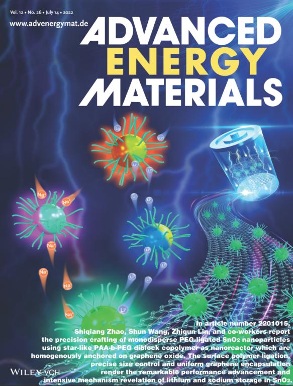 近日,《Advanced Energy Materials》(影响因子:29.698)将我校赵世强副教授第一作者的研究论文“Advancing Performance and Unfolding Mechanism of Lithium and Sodium Storage in SnO2 via Precision Synthesis of Monodisperse PEG-Ligated Nanoparticles”选为期刊封面文章。我校王舜副校长与佐治亚理工学院林志群教授为通讯作者。该研究工作受到国家自然科学基金项目(21905208)的资助。