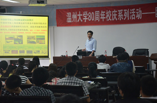 2013年5月19日,女同av 成功举办女同av 80 周年校庆系列活动—瓯江高端学术论坛(校友专场)。应女同av 邀请,来自上海硅酸盐研究所副所长杨建华教授、浙江大学化学系陈宝梁教授参加了本次高端学术论坛,并作了专场主题报告。