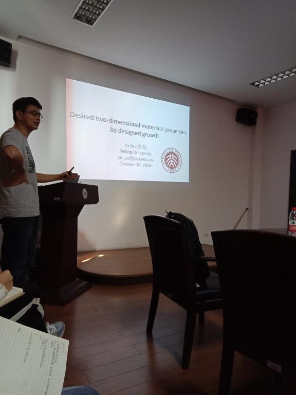 会议上,叶堉老师围绕主题“Desired two-dimensional material's properties by designed growth”对他近期的研究工作进行了详细的介绍。首先介绍了二维层状材料的发展背景。传统硅半导体的发展,面临着短沟道效应和高消耗等问题,而二维层状材料由于原子级的厚度及可调的带隙等性质一定程度上弥补了这样的缺陷。目前二维层状材料的发展也存在着一些局限,如材料与金属电极间存在着很大的接触电阻,开电流比较小,亚纳米级的晶体管的制作工艺等。接着叶堉老师为我们展示了他的研究进展和提出了通过设计生长提高材料的性能的思路。叶堉老师清晰明了的思路,简单易懂的话语给我们描绘了一位科研者从发现科研问题到解决科研问题一步步走来的过程,淋漓尽致的展现了一位科研者严谨认真勇于探索的科研素养,为我们日后的科研之路提供了借鉴,为大家树立了良好的榜样。