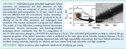 我院陈庆老师指导的李娜梅等同学利用电化学沉积技术与模板技术相结合制备出多层的Au-Fe双金属的纳米线,再通过氧化和真空加热处理得到Au-γ-Fe2O3复合纳米线(ACS Appl. Mater. Interfaces 2015, 7, 10534?10540; DOI: 10.1021/acsami.5b02087)。借助于XRD, SEM和 TG 等技术探索了合成机理,Au-Fe复合纳米线先转化成Au-γ-FeOOH,再转化成Au-γ-Fe2O3。该结构新颖独特,不同于以往的贵金属表面掺杂,Au被包裹在内部,表现为3-10nm的颗粒,纳米线的外侧为多孔的γ-Fe2O3薄膜。材料合成后,小组还做了气体传感性能测试。结果表明Au掺杂在半导体内大大提高了单纯铁氧化物对还原性气体的响应,这归功于在Au与γ-Fe2O3形成了开路肖特基结。该纳米线对乙醇响应尤其灵敏,选择性好,是检测乙醇的理想材料。