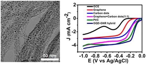 图1 石墨烯量子点/石墨烯纳米带(GQD-GND)杂化材料的TEM图和氧还原性能比较图