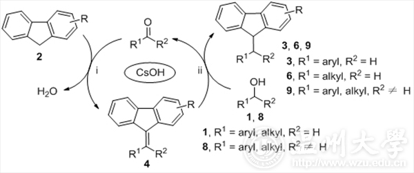 我院徐清教授指导11级陈建辉、14级李洋等研究生同学,采用课题组发展的醛或酮催化方法,以相对绿色的醇类化合物取代卤代烃为烷基化试剂,在CsOH参与的碱性条件下,实现了无需使用过渡金属催化剂的9-单取代芴的高选择性合成(Green Chem., 2017, 19, 623-628;DOI: 10.1039/c6gc02518h)。