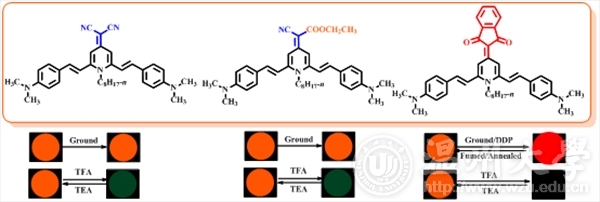 该课题组周一斌等同学设计合成了一系列以丙二腈、氰基乙酸乙酯为电子受体,以蒽为电子给体的D-π-A型4H-吡喃类荧光分子 (Scheme 6,Dyes Pigm. 2017, 141, 428),发现这些化合物的酸致变色性质只与电子受体的结构类型相关,而其压致变色性质则同时受到电子给体蒽单元的连接位置和电子受体结构的影响。并且由于这些4H-吡喃类荧光分子的固态荧光变色性质可以通过不同的外在刺激进行调控,以不同的外在刺激为输入项、不同的荧光颜色为输出项可以构建不同的分子逻辑门。