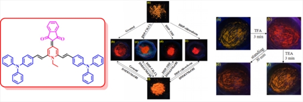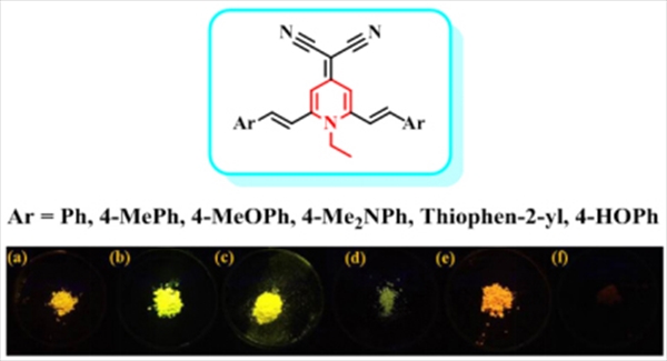 我院黄小波、吴华悦课题组近年来一直致力于具有聚集诱导发光性质的有机分子的设计、合成及其固态荧光刺激响应性质研究。该课题组黎辉等同学通过用N-乙基取代二氰亚甲基-4H-吡喃母体结构中的氧原子成功构建了一类具有扭曲分子构象的D-π-A型二氰亚甲基-1,4-二氢吡啶类衍生物 (Scheme 1, J. Phys. Chem. C 2015, 119, 6737),发现这类化合物具有优异的聚集诱导发光性质,并且这种聚集诱导发光性质是由聚集态下分子内的旋转受阻所导致。