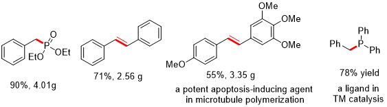 女同av 与深圳大学联合培养博士后马献涛博士在我院徐清教授指导下,通过巧妙设计、以相对绿色的醇代替活泼毒性大的卤代烃为烷基化试剂,在催化量四丁基碘化铵作用和无溶剂条件下,实现了较为温和的C-OH键的转化反应、实现了新的C-P(O)键的高效绿色构建方法、发展了一系列有机膦化合物合成新方法(图1b)。该方法底物适用范围广,不仅包括较为活泼的苄醇类伯醇、杂芳基甲醇,甚至较为惰性的脂肪伯醇也可以作为底物用于有机膦酸酯衍生物的合成。文献调研显示,能在无过渡金属催化剂条件下直接对活性较低的脂肪醇实现活化并加以合成利用的例子还极少。此外,该方法还可以拓展到二烷基膦酸酯、烷基氧膦以及双氧膦化合物的高效合成,并进一步用于一锅法合成具有抗癌生物活性的1,2-二芳基乙烯化合物以及三烷基膦配体的高效克级合成(图2)。与已知合成方法相比较,这些方法反应条件温和、副产物少、大大降低了对环境的污染。因此,该方法具有反应条件简单、原料廉价易得、底物范围广、污染小、绿色高效等诸多优点。