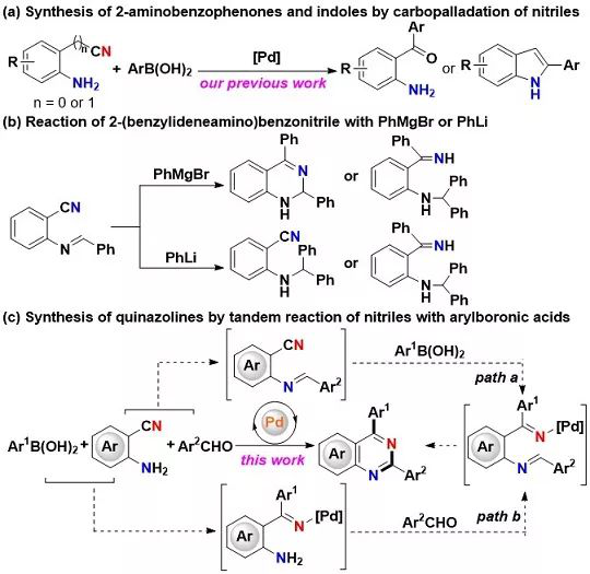喹唑啉及其衍生物是一类重要的含氮杂环化合物,广泛存在于各种天然产物、药物以及配体分子中。因此,发展新的合成策略来构建含喹唑啉骨架的化合物具有十分重要的意义。众所周知,腈类化合物由于其碳氮三键的惰性,通常在金属有机反应中作为溶剂或配体。1999年,Larock报道了利用腈类底物合成碳环化合物的方法。随后不同课题组发展了各种腈类化合物参与的金属催化反应。该类反应的主要挑战是所得产物往往局限于酮类化合物,腈类底物的氮原子难以转入到目标产物中,降低了反应的原子经济性。为了实现腈类化合物高效转化,陈久喜课题组利用商品化的邻氨基苯甲腈、芳香硼酸和芳香醛的三组分串联反应策略“一锅法”高效合成了喹唑啉类化合物。