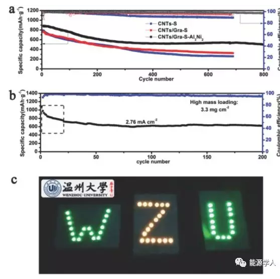 图5. a)CNTs-S、CNTs/Gra-S 、CNTs/Gra-S-Al3Ni2电极在1 C下的长循环稳定性对比图;b)CNTs/Gra-S-Al3Ni2电极在载硫面密度为3.30mg/cm^2,电流密度为2.76mA/cm^2时的循环性能图;c)串联的三个CNT/Gra-S-Al3Ni2电池的数码照片可以点亮2835个LED模块(额定电压12 V和额定功率3 W)的51个绿色指示灯。