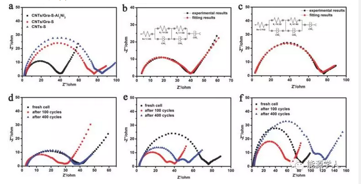 图4. a)三种电池的电化学阻抗对比图;b)CNTs/Gra-S-Al3Ni2 和c)CNTs/Gra-S电极的电化学阻抗拟合前后对比图以及相应的电路图;d)CNTs/Gra-S-Al3Ni2 e) CNTs/Gra-S和f) CNTs-S电极在1 C下循环前后的阻抗对比图。