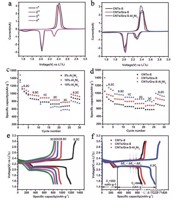 图3. a)CNTs/Gra-S-Al3Ni2电极前四圈CV曲线图;b)三种电极的第二圈CV曲线对比图;c)CNTs/Gra-S-Al3Ni2电极中不同Al3Ni2含量的电极倍率对比图; d)CNTs/Gra-S-Al3Ni2、CNTs–S、CNTs/Gra-S电极在载硫面密度为0.8mg/cm^2时的倍率性能对比图;e)CNTs/Gra-S-Al3Ni2电极在不同倍率下的充放电平台曲线图; f) CNTs/Gra-S-Al3Ni2、CNTs–S、CNTs/Gra-S电极在0.2 C 下的充放电平台对比图。