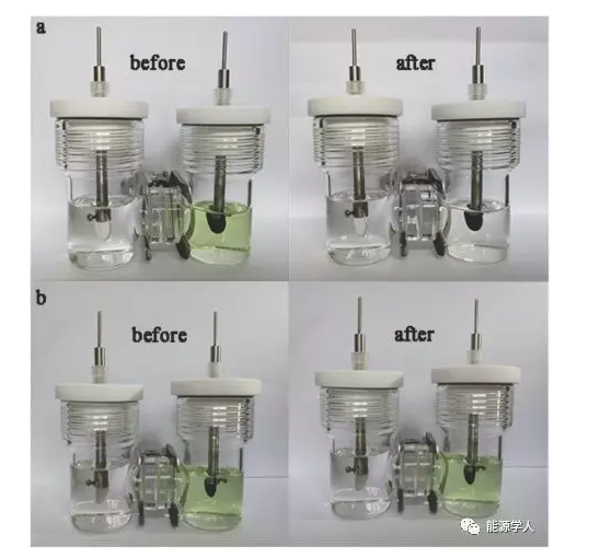 图6. H型电解池CV测试示意图:a)CNTs/Gra/Al3Ni2和b)CNTs/Gra电极测试前和循环150圈后的电解液变化对比图。