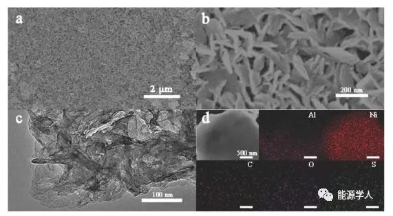 图2. a, b)CNTs/Gra/Al3Ni2电极在经过10圈的三电极测试后(CNTs/Gra/Al3Ni2-10cyc)的低倍和高倍SEM图; c)CNTs/Gra/Al3Ni2-10cyc电极的TEM图;d)CNTs/Gra/Al3Ni2-10cyc电极的STEM图和对应的元素扫描图。
