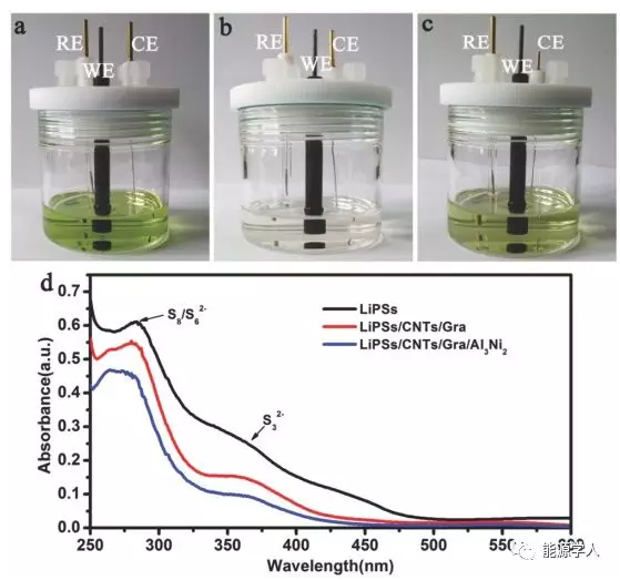 图1. a)三电极测试装置示意图; 电极经过三电极测试循环后的照片b)CNTs/Gra/Al3Ni2和c)CNTs/Gra;d)LiPSs溶液以及经过三电极测试后的CNTs/Gra/Al3Ni2和CNTs/Gra电极溶液的紫外曲线。