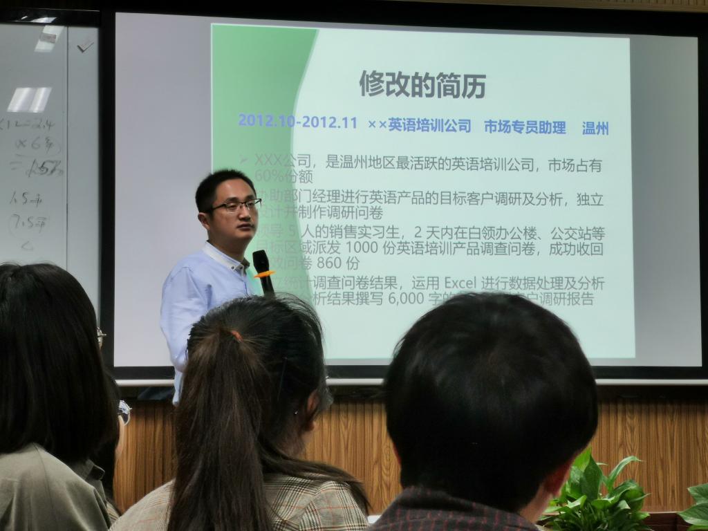 招聘会前夕,为提高我院学子应聘成功率,举行了“简历会诊”讲座,活动邀请到温州商学院的吴玉伟老师,为现场30余名大三、大四的学生进行“简历会诊”。讲座上,吴老师通过对“能力=知识+技能+特质”这一公式拓展与深究,使同学们更好的掌握写简历的技巧,同时与在场同学的交流互动,使同学们对各自简历中存在的优缺点有了更清晰的认识。