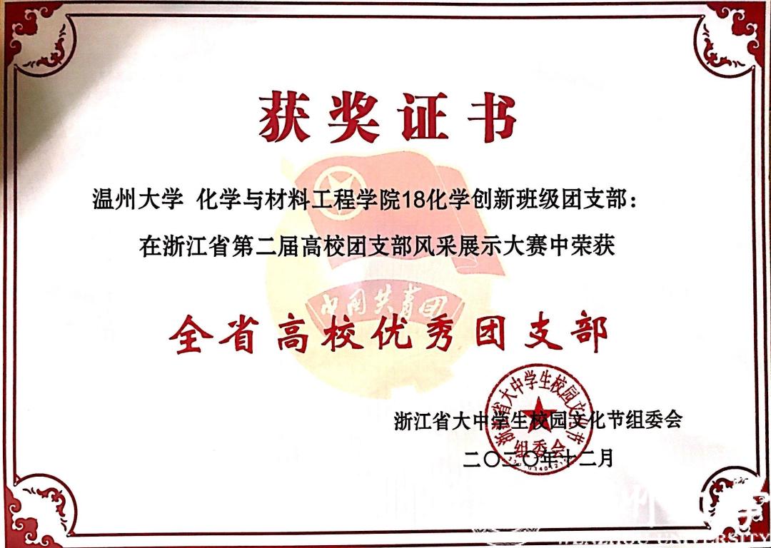 2020年12月30日,由浙江省大中学生校园文化节组委会主办、中国计量大学承办的浙江省第二届高校团支部风采展示大赛决赛在中国计量大学落下帷幕。我院18化学创新班团支部荣获全省高校优秀团支部。
