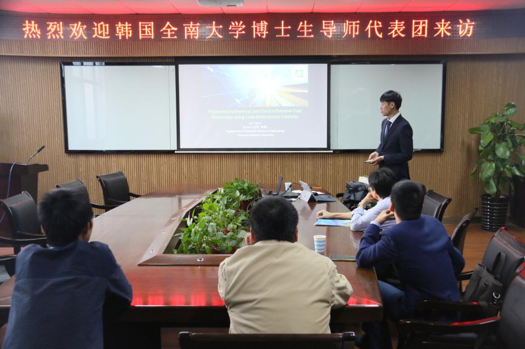 24日下午,韩国全南大学博导Sim,Uk(沈旭)教授来访化材学院,参加中韩博导与教师交流会。会上,副院长杨小平代表全院对Sim,Uk教授的到来表示热烈欢迎,并全方面地对学院专业建设及学院发展情况作了详细介绍。随后,由人事处副处长蒋俊,副院长张兴国,院长助理夏远志向Sim,Uk教授介绍了自己的科研团队与成果,双方商谈合作契机。最后,双方就材料工程专业开展了深入的探讨,Sim,Uk教授也对他们目前所在研究材料的成果进行了全面的展示,并对我院的发展与取得的各项成果表示赞许,希望双方能开展更深层次、更加全面的合作。