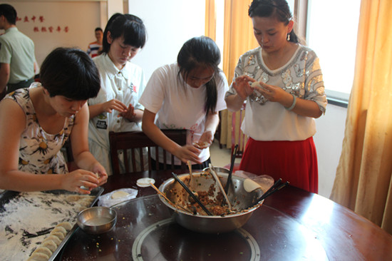 上午10时30分,按照活动安排,所有成员齐聚食堂,大家都磨拳擦掌跃跃欲试。一会儿,食堂工作人员将买好的饺子皮和饺子馅端上来,大伙立即着手开始包饺子。由于人员很多,所以先按大家擅长的技巧把大家分到不同的桌子,大家分头行动。材料上来,包饺子活动好戏立刻上演。包饺子看着简单,可是如何把饺子包的皮薄馅多且煮不破可是非常需要技巧的。不过实践队的指导老师林萍老师拿出了让人刮目相看的功力,饺子包的真是既漂亮又实在。队员们边包饺子边不时嬉闹,活动现场洋溢着欢乐。11:30,包好的饺子即刻送到食堂工作人员那里,片刻过后热腾腾的饺子呈现在大家面前。队员们拿起碗迫不及待的想品尝到自己亲手做的饺子。虽然饺子有大有小形状各异,还有的因为密封不严下水后就煮开了皮,但是并不影响大家吃饺子的快乐。大家也表示能吃到自己亲手包的饺子很幸福。中午12:30左右,活动结束。