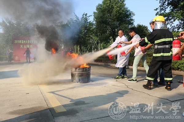 消防队员撤离后,消防灭火练习正式开始。实验室老师演示了试验台面不慎起火时的灭火方法,利用灭火毯、沙土和湿毛巾都可以灭火。校卫队的老师向同学们展示了消火栓及灭火器的正确使用方法,并让同学们亲自参与油桶灭火。一阵阵的干粉气雾喷出,大火很快就扑灭,整个演习结束。