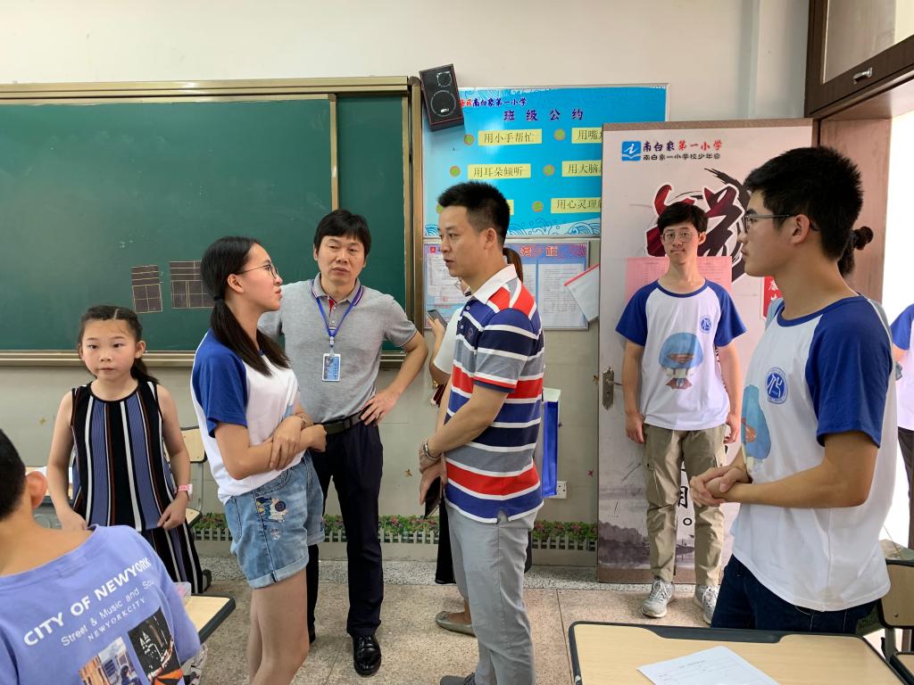 上午9时,熊琳书记一行人抵达温州南白象小学慰问“心飞”、“绿苗”两只暑期社会实践队。期间,熊琳书记向队长了解实践队活动开展的具体内容,鼓励队员在实践过程中结合专业提升教学水平,学以致用注重特色提升,反思课程评价注重传承发展,并向同学们分享了自己支教、实践的亲身经历,鼓励同学们多深入社会,加强锻炼,增长才干。周敬业副书记询问了队员们的身体状况,叮嘱支教学生要关注听课小学生的到勤、回家情况,注意安全,有情况及时跟指导老师沟通。