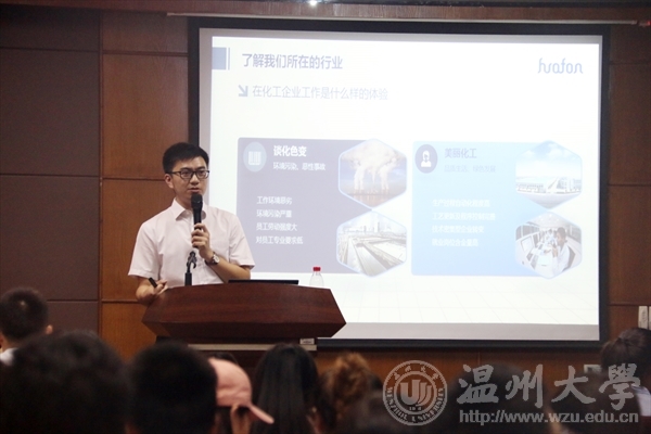 宣讲会上,华峰集团人力资源部贾景飞用PPT和视频宣传片相结合的方式向学生展示了公司概况。华峰集团是一家以化工新材料为主,金属、金融、物流、贸易等产业为辅的民营股份制企业。另外,他详细介绍了华峰集团的企业选择、行业选择、职业定位等,其中包括化工行业的职业前景与现状、企业管理模式、产品与岗位介绍、公司分布地点、员工组成、公司发展历程和成长趋势、企业社会责任与发展战略前景。他还为在场的学生明确说明了华峰集团需要什么样的员工,并且分析选择这个企业,企业员工能得到什么样的发展,能享有的薪资福利。