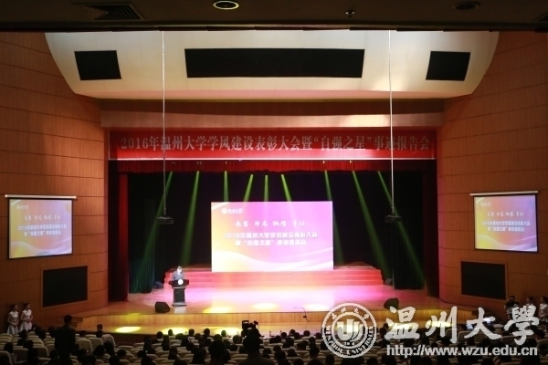 4月27日下午,我校2016年学风建设表彰大会暨“自强之星”事迹报告会在大学生活动中心育英大礼堂举行。校领导李校堃、林娟娟、牟德刚、赵敏、吴金法、陈安金、方益权、潘玉驹,校友陈国同及其夫人刘秋霞,浙江嘉华房地产有限公司总经理陈耀兴,阿联酋温州同乡会会长林时永、执行会长池云虎一行,家长代表,相关部门负责人,各学院、学区分管书记,全体辅导员,相关班主任,学院、学区学生代表参加表彰大会。