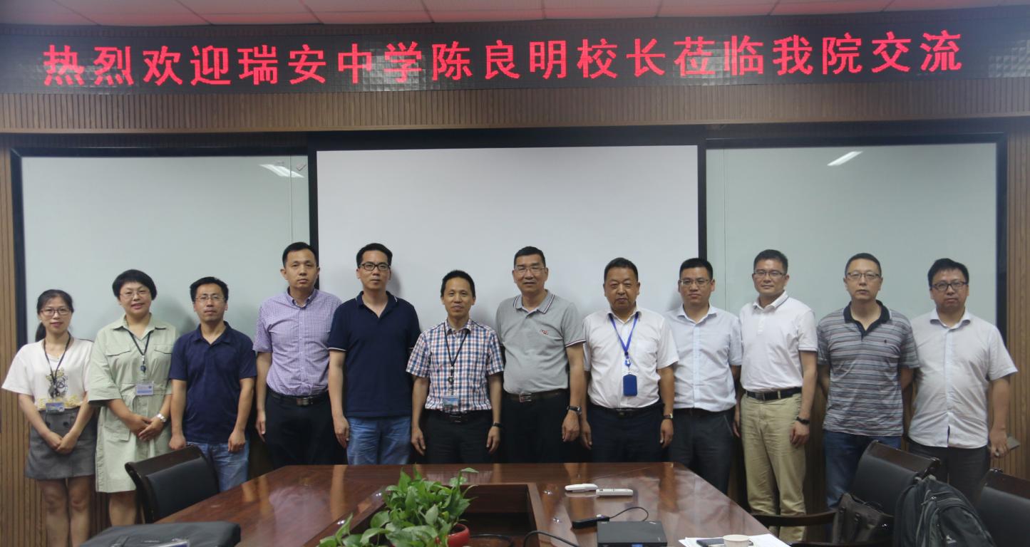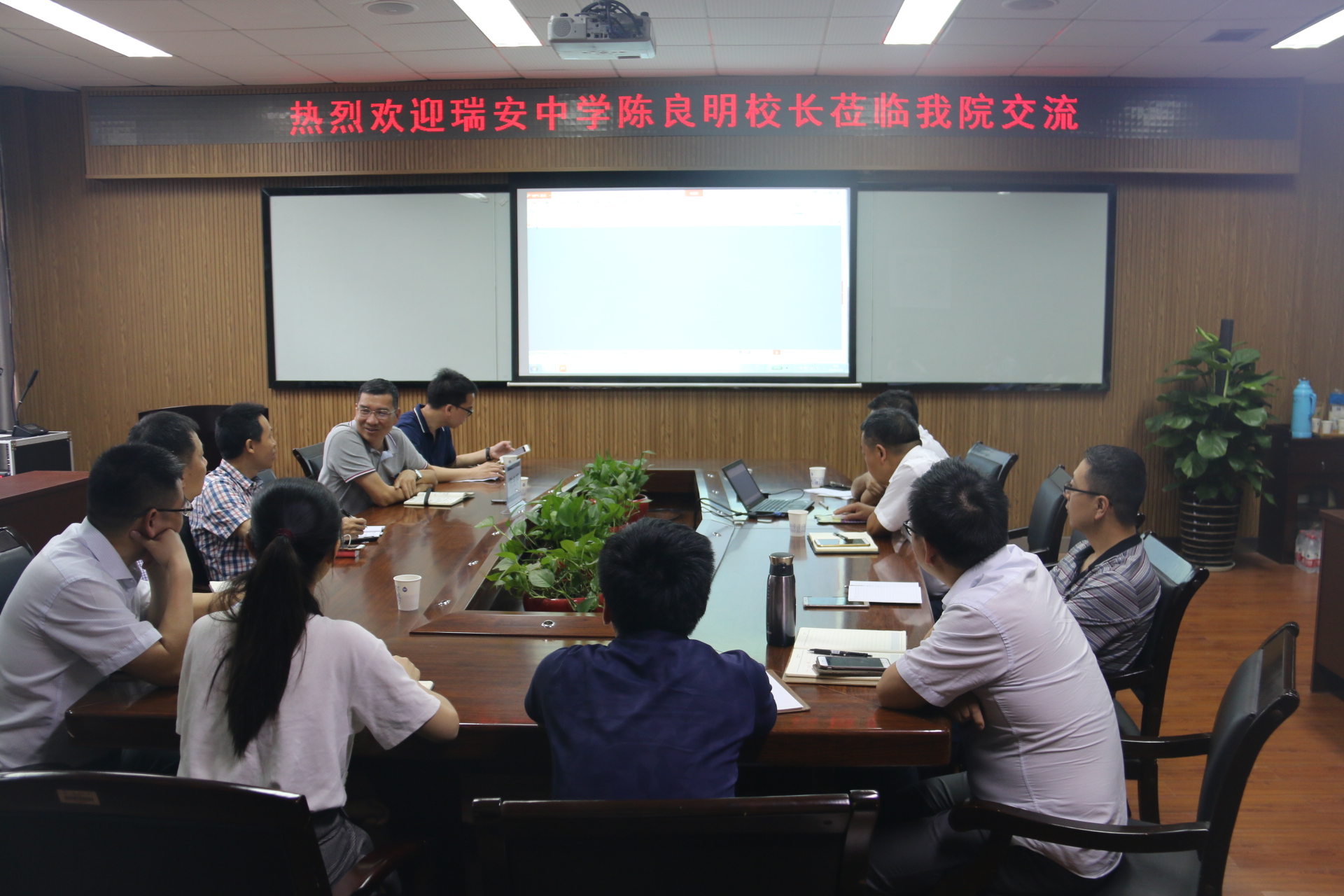 王舜院长代表学院对陈良明校长一行的到来表示欢迎,并介绍了我院在教育教学、师资建设、招生就业等方面的工作成效。同时高度肯定了瑞安中学近年来取得的成绩,希望双方今后进一步加强交流合作,在教育、教学和管理等方面进行深入研究、高度融合,围绕人才培养工作,全方位推进教育创新。