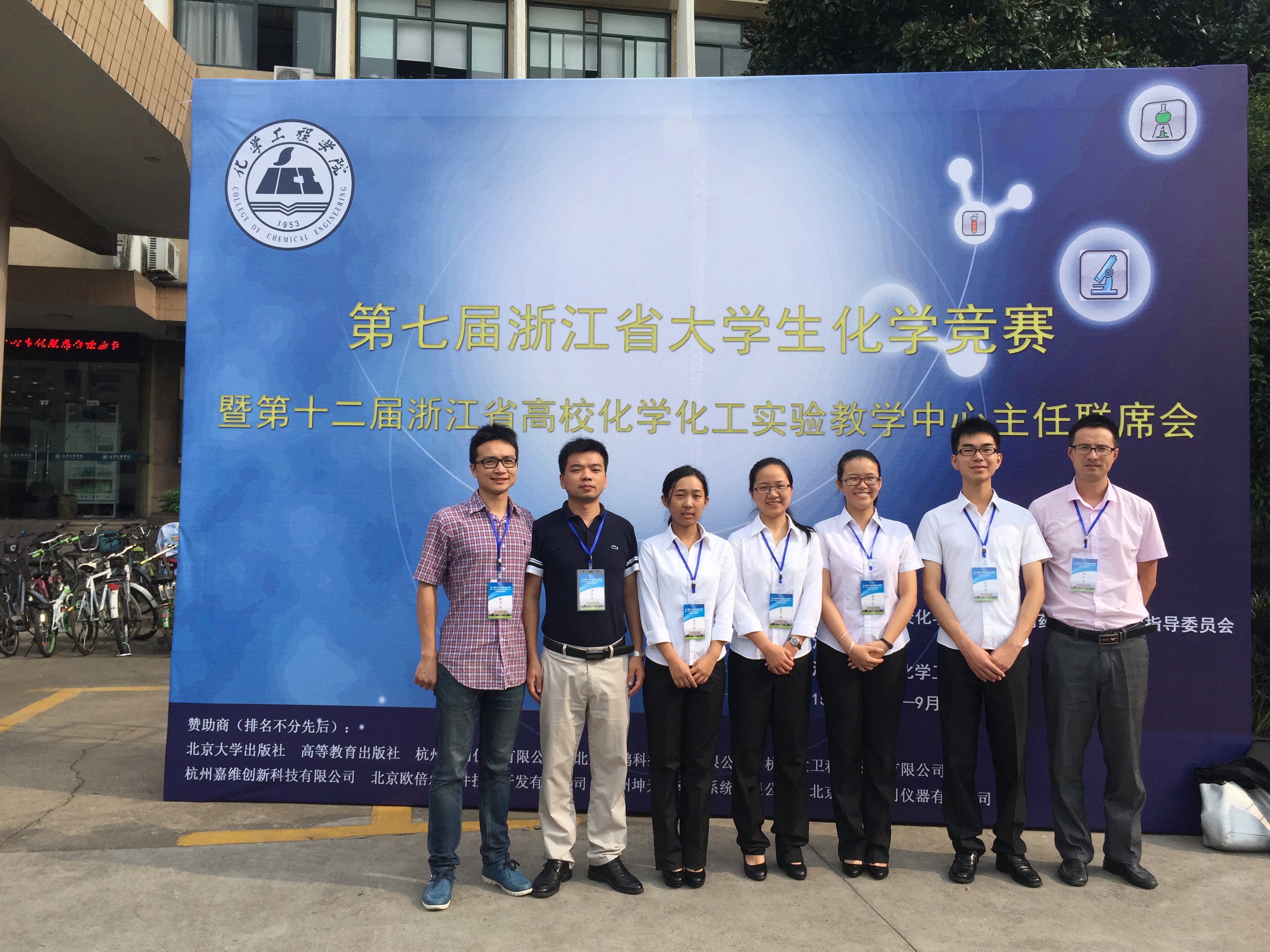 浙江省大学生化学竞赛由浙江省高校基础化学实验技能大赛和浙江省大学生化学学科竞赛转型发展而来,于2015年被列为浙江省大学生科技竞赛项目。第七届浙江省大学生化学竞赛分为“化学知识测试”、“创新项目研究”、“答辩”、“实践能力考核”四个环节,在化学知识、化学基本能力、化学综合实践能力及创新意识、创新能力等方面对学生进行了全面考察。参赛队伍通过网上化学知识测试,“Salen配合物的合成及其催化性能研究”的创新课题研究及研究成果的初赛评选成功进入决赛。我院参赛队伍通过20分钟的ppt汇报及答辩环节介绍了课题研究背景、Salen配合物的合成和表征、Salen配合物催化氧化反应及总结与展望四个方面。我院学生精彩的汇报、灵活的答辩,赢得了评委的好评,最终获得一等奖。