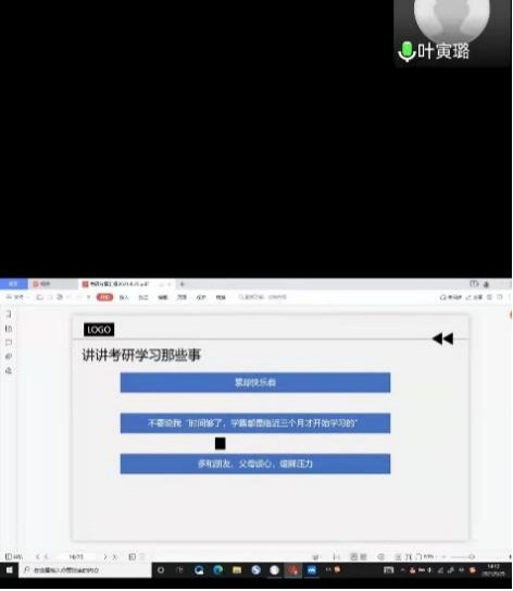 第一个环节是由主讲人分享他们的报考、心态调整的经验。第一位主讲人叶寅璐分别从报考的注意事项、考研政策变化以及考研学习那些事等方面为我们讲述了报考需要注意的事项和调整心态的方法。