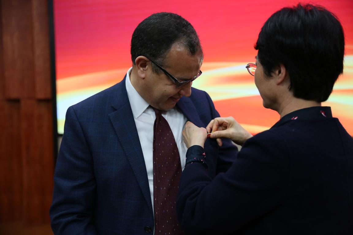 相关负责人介绍了学院在新型能源材料及电池研究取得的一些列成果,林娟娟书记为Khalil Amine教授颁发荣誉教授聘书并佩戴校徽,温州市高教园区建设管委会林照光主任为Khalil Amine教授颁发招才大使聘书。