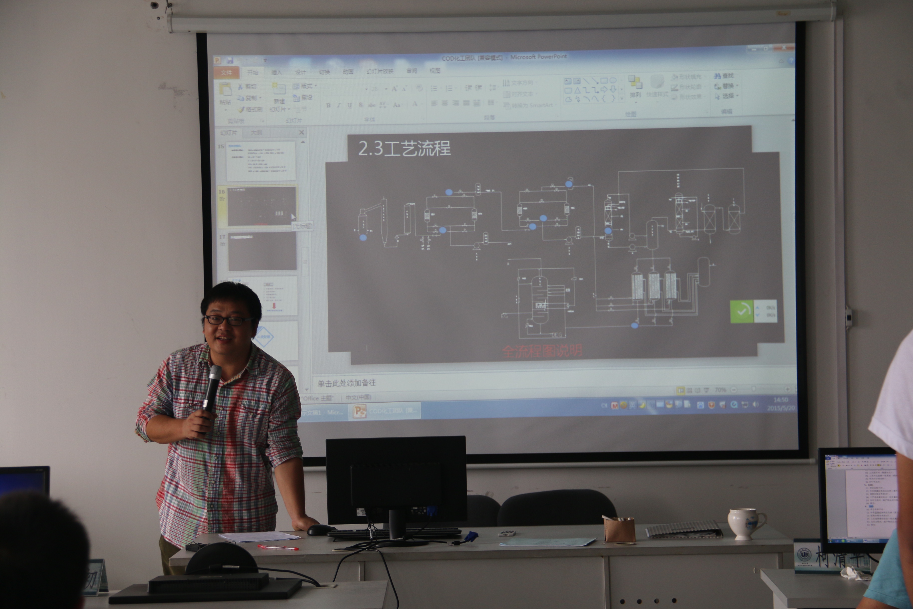 比赛伊始,徐进老师为大家简单地介绍了化工设计竞赛的背景、举办目的和意义,还有评审规则。每支参赛队伍按先前排好的顺序出场,并有8分钟的PPT展示设计方案和10分钟的答辩时间。每个评审老师对团队表现进行评分。最后取平均分,并当场评出一二三等奖。