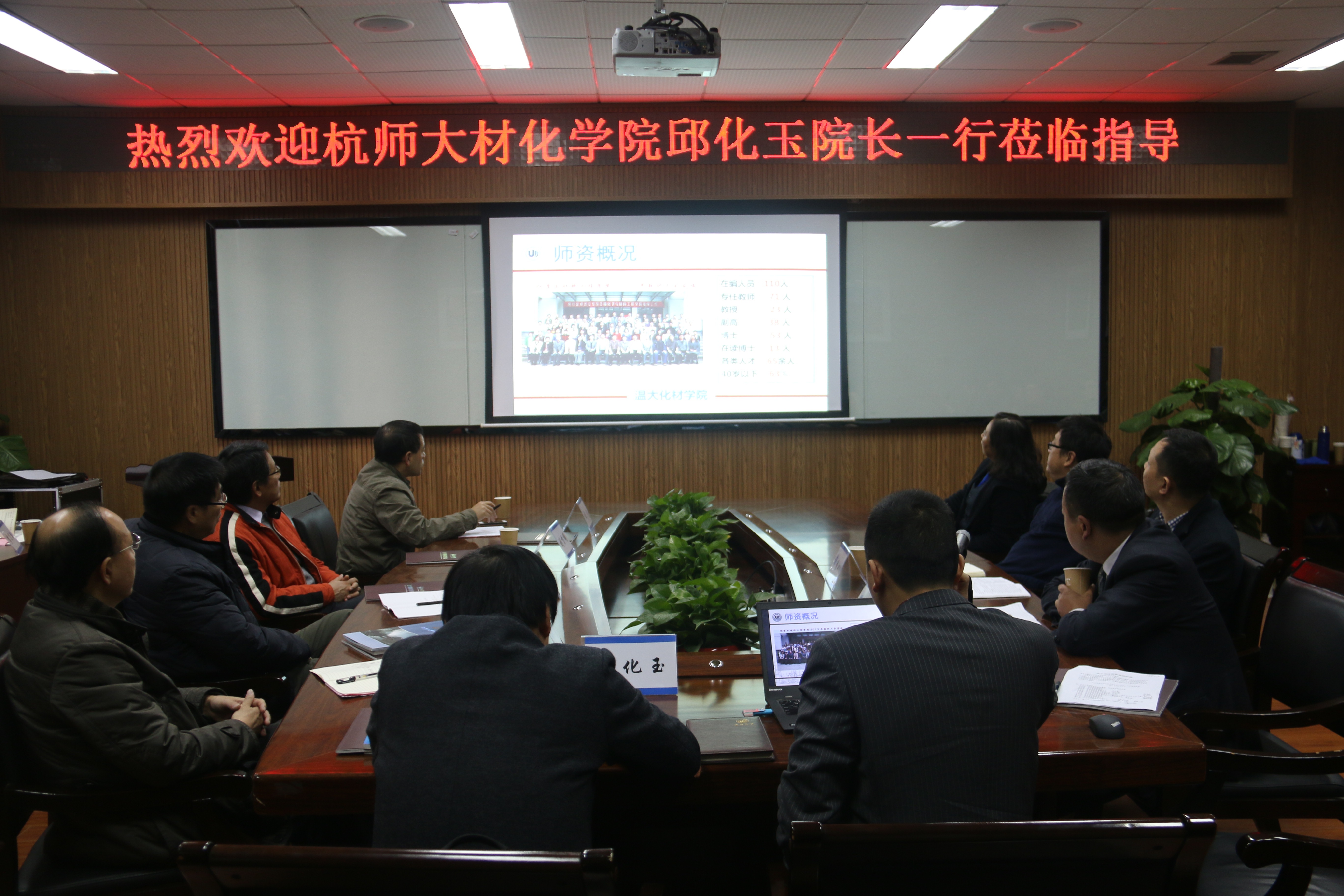 2015年12月8日,杭师大材化学院邱化玉院长、李兴听书记等一行莅临我院,围绕化学学科和专业建设方面进行调研。院长王舜、党总支书记方乐平、党总支副书记潘从义以及学院其他相关教师参加。
