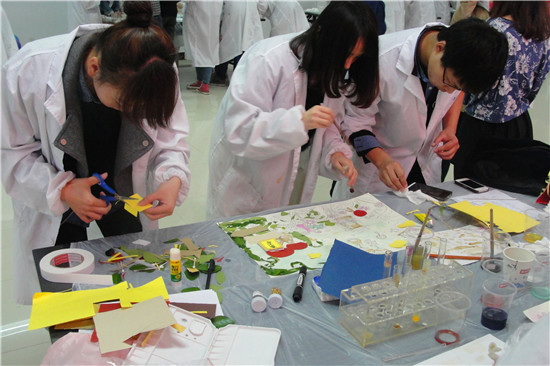 来自豆豆队的同学告诉记者:“我们在素描纸上首先描绘的是规规矩矩、棱角分明的高楼大厦,但是我们随后用的化学试剂却是色彩缤呈。这代表着我们90后的一些心声,我们在父母、社会建造的规规矩矩的世界里,也要展现自己与众不同的一面,突破与创新是我们想要表达的思想!”