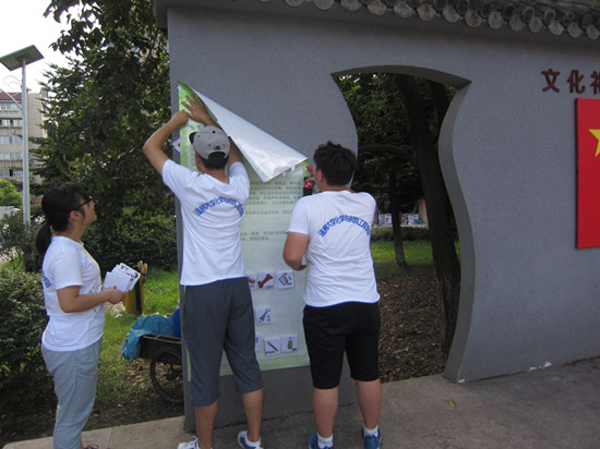 上午8:00,绿袖子实践队一行人一来到春秋社区,就迅速开始布置场地,稍后温州市城市管理与执法局环境卫生管理处的领导和工作人员也莅临春秋社区,为我们带来了帐篷椅子和水表示慰问,对我们的活动给予了充分的肯定与赞赏。在工作人员的帮助下当大家顶着烈日搭起了帐篷,挂起了横幅,并摆出队员们准备的游戏道具以及利用废旧物品精心制作的手工艺品。过往居民都被精美的手工艺品、有趣的游戏和可爱的环保袋所吸引,纷纷驻足停留。在手工艺品展示区,队员们耐心细致地向居民讲解废旧物变废为宝的制作工艺,赢得了来往居民的连声赞叹。只见这边一批居民认真思考着灯谜中的环保问题;那边一群居民则团团围在垃圾分类游戏区开展垃圾分类的小游戏。行人们纷纷表示我们的宣传办得很有意义,在作品参观中唤醒居民的环保意识,在游戏中积累居民的环保知识。活动在最炎热的时候举行,如柱的汗水中,队员们为宣传活动的完美举行而喜笑颜开。