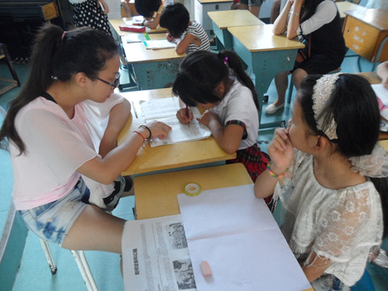 在今天“作业辅导”、“影视欣赏”、“趣味化学”、“品味文化”等众多课程当中,“趣味化学”以绝对性的优势抓住了同学们的眼球。大变颜色、可乐喷泉等小实验引得同学们惊呼阵阵,掌声连连。作业辅导课队员们并没有因为每天必上而感到厌烦,相反,随着队员和同学们的情谊日趋深厚,队员们对于同学们的辅导更是上心了。