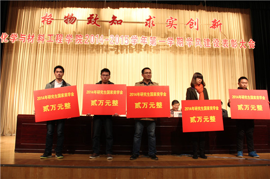 紧接着,王舜副院长、马德琨院长助理、陈久喜院长助理以及孙安梭副书记分别宣读了2013-2014学年研究生国家奖学金获得者名单、我院2014年学生科技竞赛获奖情况、我院大学生课外科技活动评比结果、我院2014—2015学年第一学期“十佳百星”名单和校、院优良学风班级名单,主席台就坐领导为获奖集体和个人颁发了奖状及奖金。期间,我院12研2班周淑美和11应化叶欣涵分别代表研究生国家奖学金获得者代表和本科生代表上台发言,与大家就如何平衡学习、工作及生活的关系,提升自我做更好的自己发表了感想,同时也对老师、同学、学院表达了由衷的感谢。