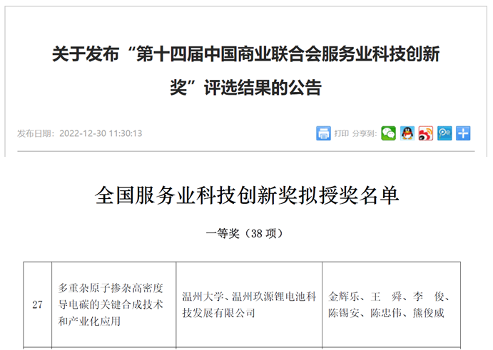 近日,“2022年度中国商业联合会服务业科技创新奖”评选结果发布,我院金辉乐、王舜、李俊、陈锡安等教师主持完成的“多重杂原子掺杂高密度导电碳的关键合成技术和产业化应用”项目获中国商业联合会服务业科技创新奖一等奖。该项目提出了多种多重杂原子掺杂高密度导电碳的关键合成技术,制备出多种高导电性、高密度、多级孔、多杂原子掺杂碳基材料,有效解决了常规碳材料因密度低、活性位点少而引起的体积容量和能量密度低、催化活性差等难题。