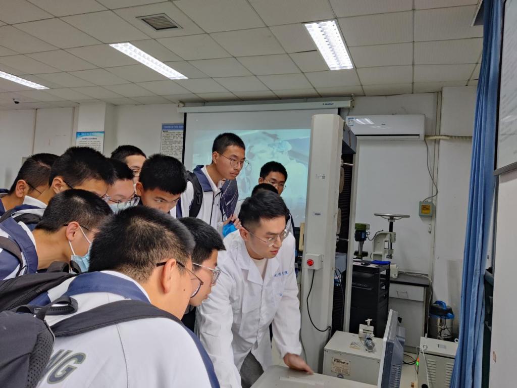 在材料性能测试实验室,志愿者介绍了与材料力学相关的万能强力仪、冲击试验机,以及透光率测试仪的测试原理、用途和测试方法。同学们现场进了塑料拉伸强度测试,切身感受到了力学强度带来的震撼。通过冲击强度测试,感受到了材料的坚韧特性。通过眼镜的透光率检测,体验到了化学的通透之美。