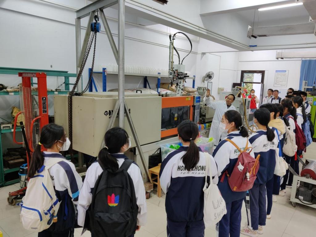 随后,同学们来到浙江省材料工程实验教学示范中心进行参观体验。彭老师向同学们介绍了材料加工常用的注塑机,并展示了中心制作的塑料水杯。志愿者介绍了流延膜机,展示了保鲜膜、中空吹塑瓶等材料制造典型工艺,拉近了同学们和工业制造设备的距离。