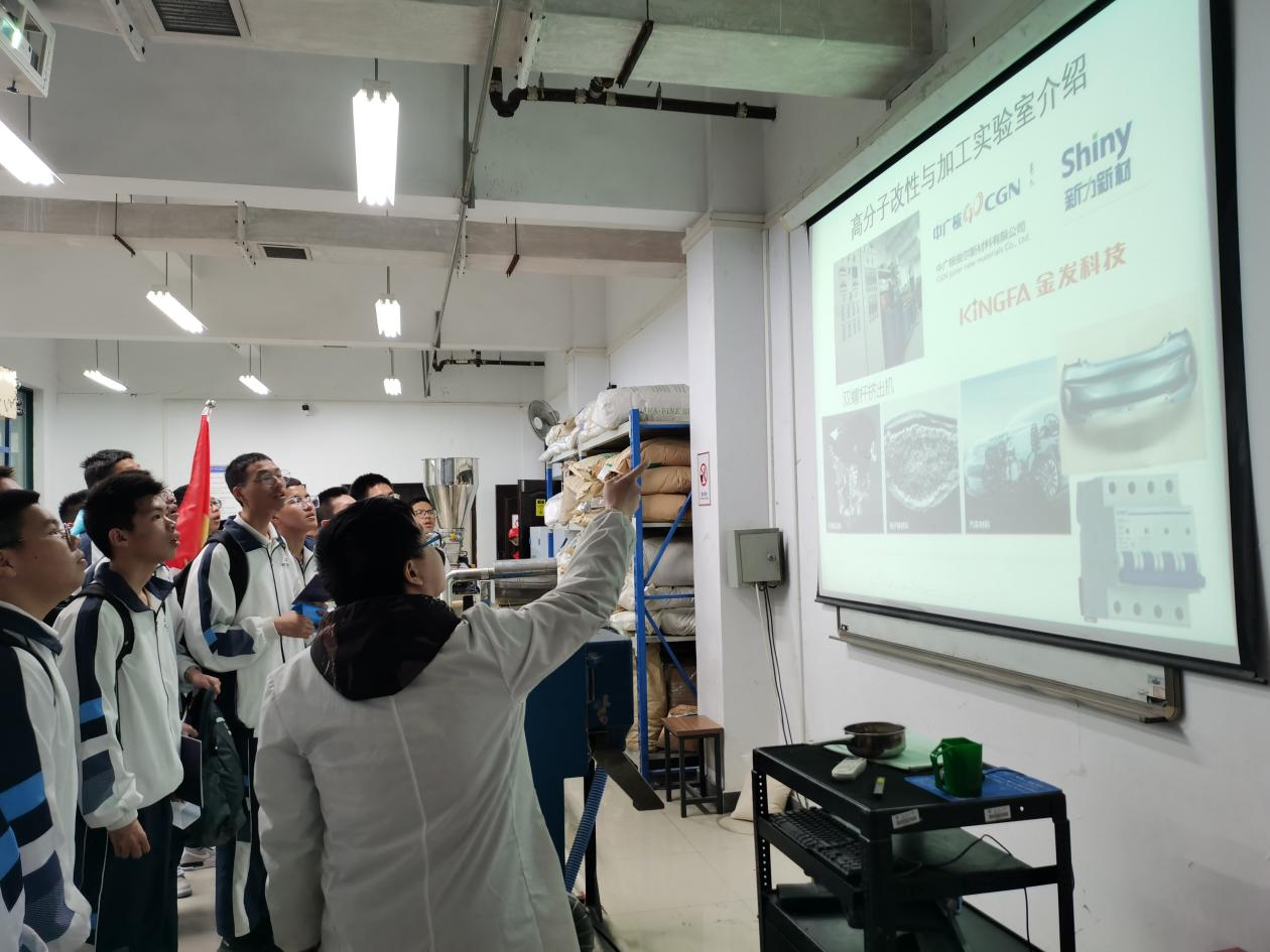 在材料改性实验室,志愿者介绍了双螺杆挤出机、行业概况、产品应用范围等。通过详实生动的讲解,同学们产生了极大的兴趣。