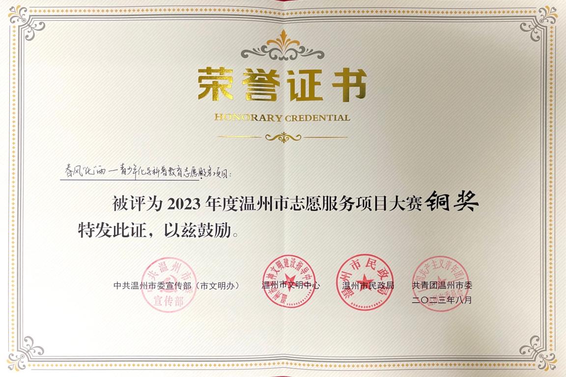 我院申报的春风“化”雨——青少年化学科普志愿服务项目与温州各地方选送的项目同台竞赛,最终获得2023年度温州市志愿服务项目大赛铜奖!