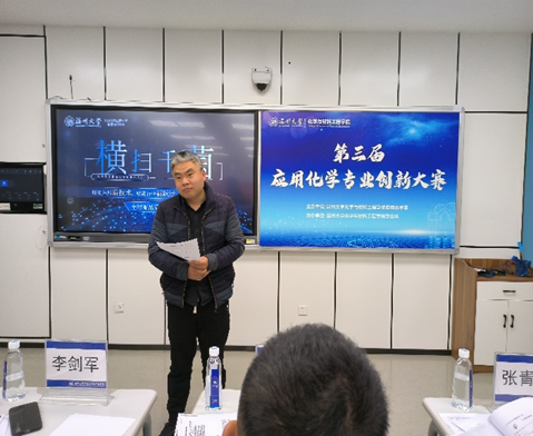 应用化学系主任王兆伦老师做总结发言,他指出本次比赛充分展现了化材学子参与科研创新的热情,希望同学们继续完善参赛项目,争取在后续的“挑战杯”、“互联网+”的竞赛勇夺佳绩。