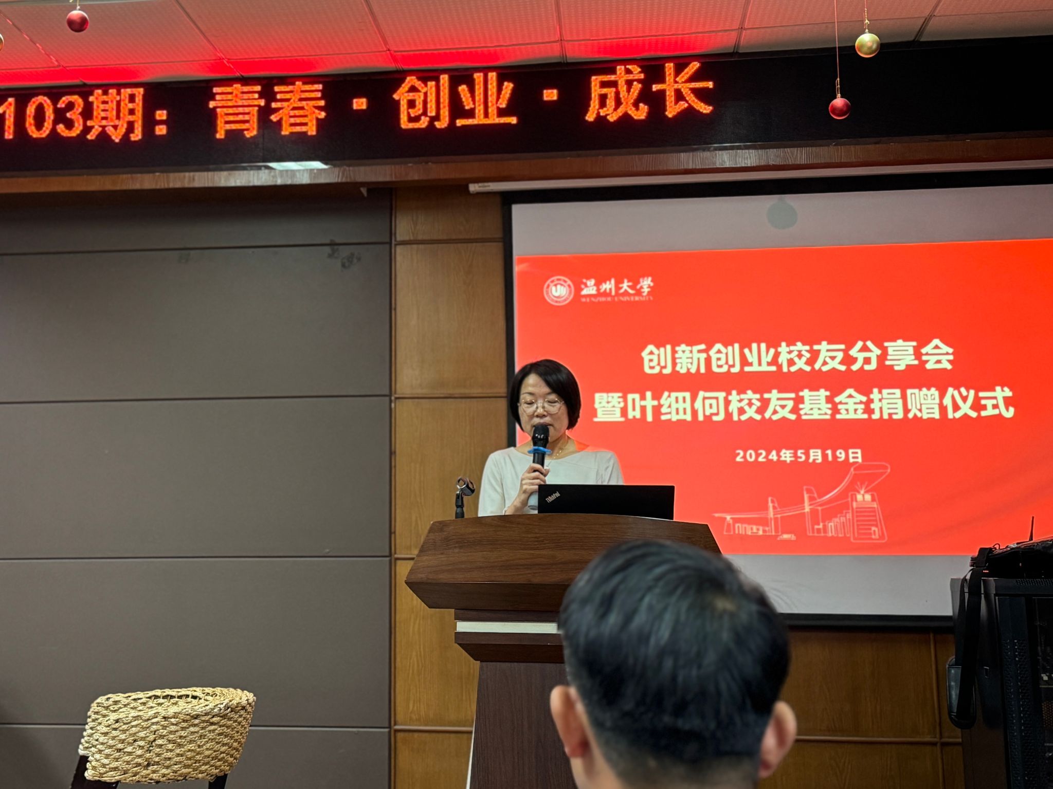 创新创业校友分享会暨教育基金捐赠仪式在化材楼11B208会议室顺利举行。我院95级工业分析校友,浙江宏舜建设有限公司总经理叶细何、01级应化校友温州瑞通化工有限公司董事长黄通丰、02级材料校友浙江环诺环保科技股份有限公司董事长张里艺三位校友受邀出席本次活动。学院党委书记刘吟、党委副书记周敬业以及学院师生代表70余人参会。活动由学院校友理事会姜化钧会长主持。