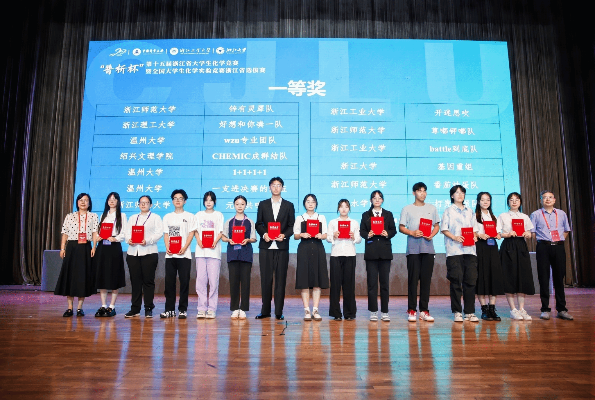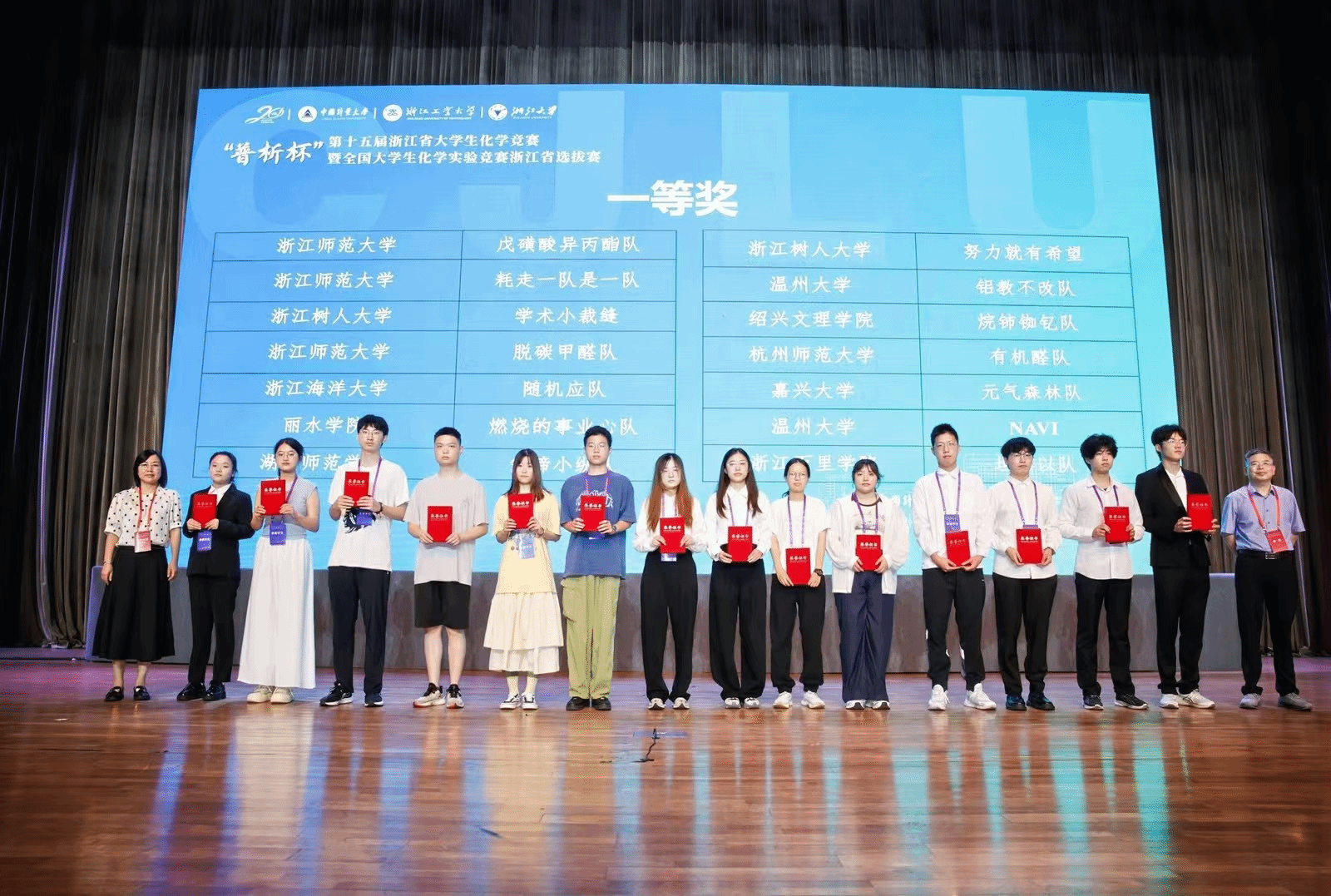 7月30日,历时3月的浙江省“普析杯”第15届浙江省大学生化学竞赛在中国计量大学圆满落幕。来自全省37所高校共计405支队伍在经过“创新项目研究”、“现场答辩”、“实践能力考核”、“化学知识测试”等环节的激烈竞争后决出了成果。本次大赛我院共有20支队伍参赛,其中8支队伍进入最后决赛阶段,最终获得一等奖5项,二等奖3项,三等奖7项的佳绩,总成绩位列全省第二,为历史最佳成绩。在决赛阶段,我院22化学(师范)2班陆思远同学凭借过硬的专业素养以及精湛的化学实验技能晋级全国大学生化学实验大赛,成为全省8位代表浙江省备战国赛的选手之一。