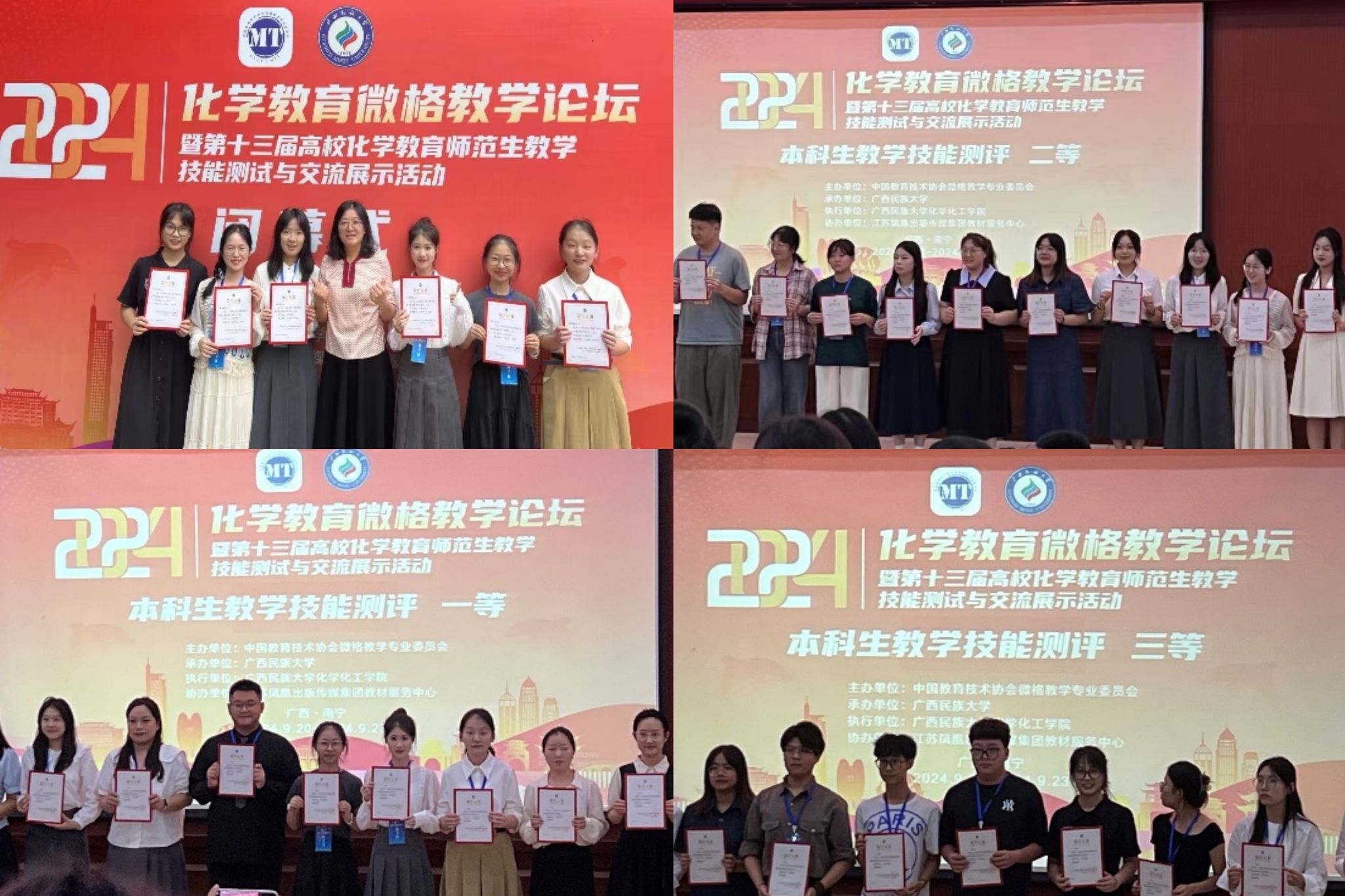 9月20日-23日,由中国教育技术协会微格教学专业委员会主办,广西民族大学承办的第十三届“高校化学师范生教学技能测试与交流展示活动落下帷幕。我院21级化学师范专业6位参赛学生共获得一等奖3项、二等奖2项、三等奖1项的优异成绩,获奖率达百分之百。