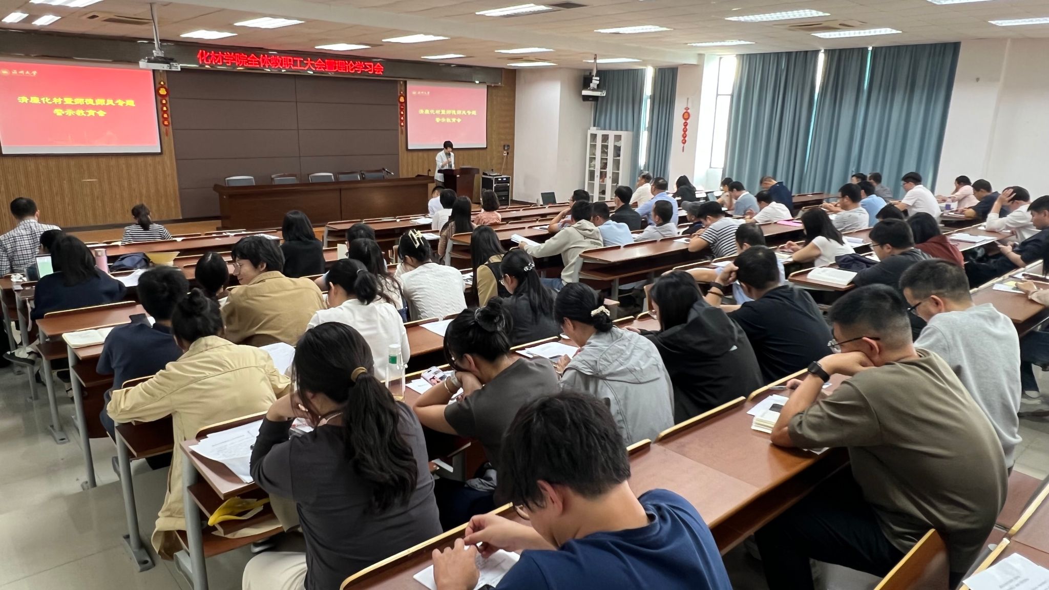 学院党委副书记、纪委书记王晓华开展师德师风专题警示教育。她聚焦“清廉化材”建设,结合教育部公开曝光的高校教师违反教师职业行为十项准则典型案例,对全体教职工开展师德师风警示教育,希望大家以案为鉴,坚定理想信念、厚植爱国情怀、涵养高尚师德,牢固树立正确的世界观、人生观、价值观、权力观,时刻保持警醒,心怀警惕,防微杜渐。