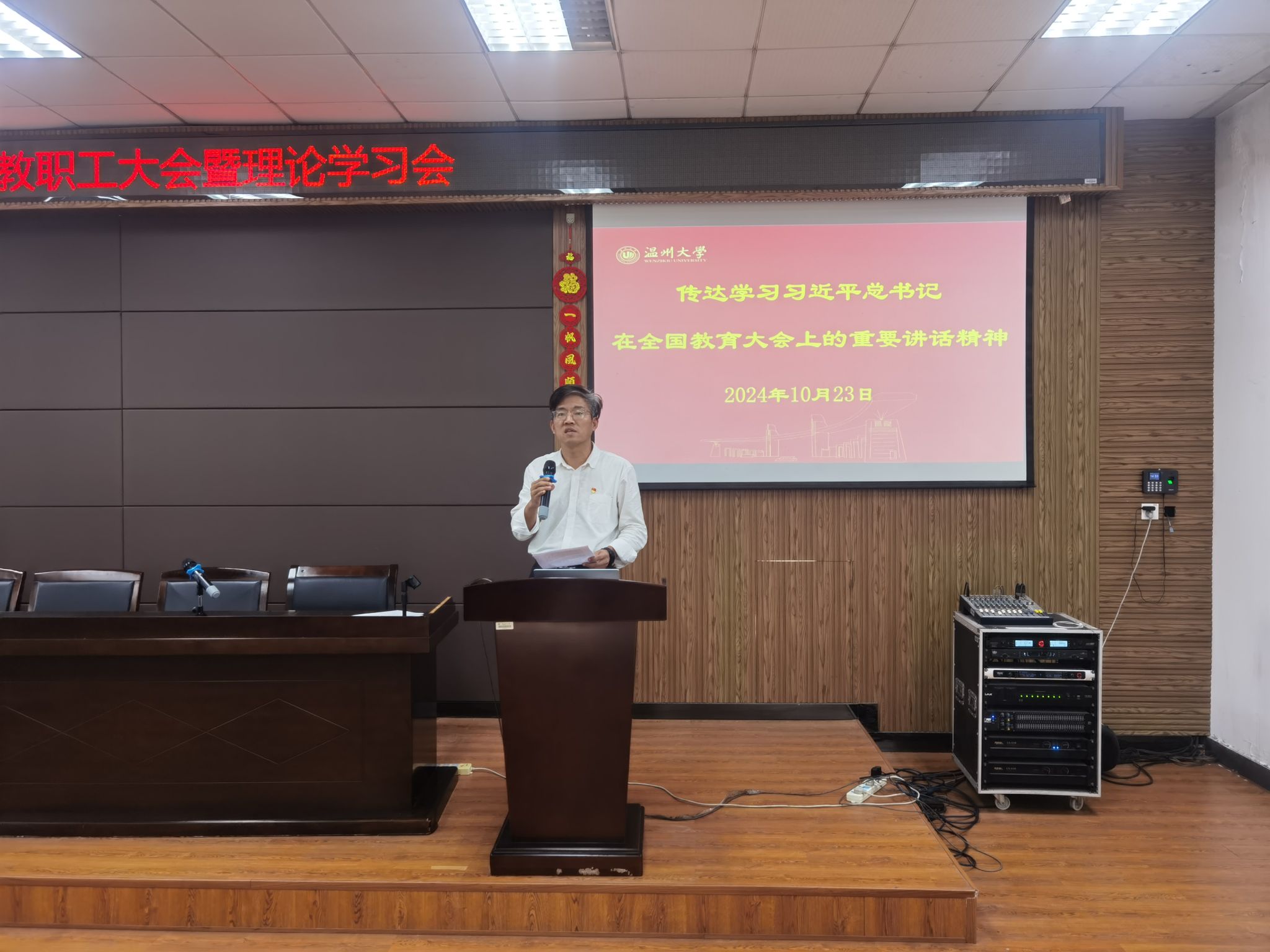 邹超为全体教职工上师德师风专题党课。首先他传达了学校关于秋季师德师风专题教育活动的有关安排,并深入解读了习近平总书记在2024年全国教育大会上的讲话精神。他强调教育是国家强盛和民族复兴的基础,每位老师要时刻明确自己是师德师风建设的主体,增强师德师风建设的责任感。他号召全体教职工要以教育家精神为引领,以高度的政治自觉、思想自觉、理论自觉、行动自觉,树师德、正师风、铸师魂、强师能,努力做好“四有”好老师,成为新时代的“大先生”。