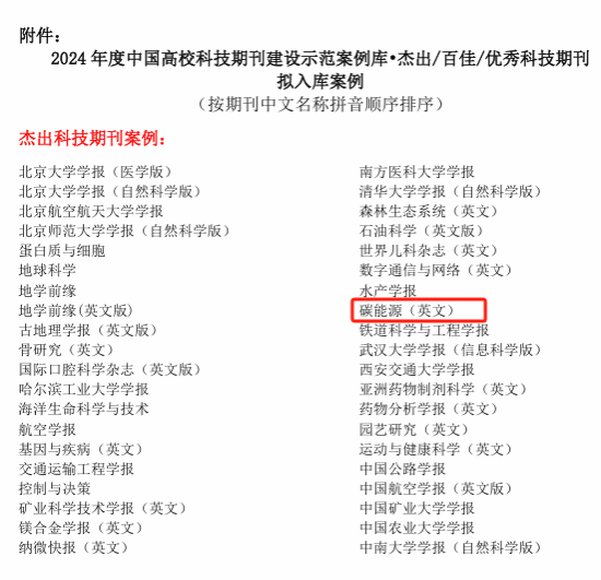 Carbon Energy 期刊入选2024年度中国高校科技期刊建设示范案例库杰出科技期刊入库案例