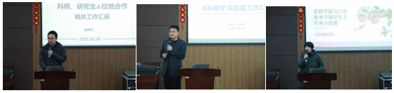 学院各分管领导部署新学期重点工作。金辉乐副院长聚焦科研与校地合作,对2025年国家自然科学基金申报,关键项目对接、科技成果转化及研究院建设等方面进行了安排与部署。张礼杰副院长强调本科教学审核评估冲刺、化学师范认证提质及实验室安全闭环管理,要求危化品“全流程可溯”、大型仪器“全周期监控”,筑牢教学科研双防线。王晓华副书记结合本硕博一体化工作体系建设,打造“家校社+产学研”协同育人新生态作说明。并就精准就业攻坚、考研全程护航、筑牢意识形态防线、寝室学情动态等方面提出专题行动倡议,聚力共护安妥开学;另就清廉学院建设作强调。