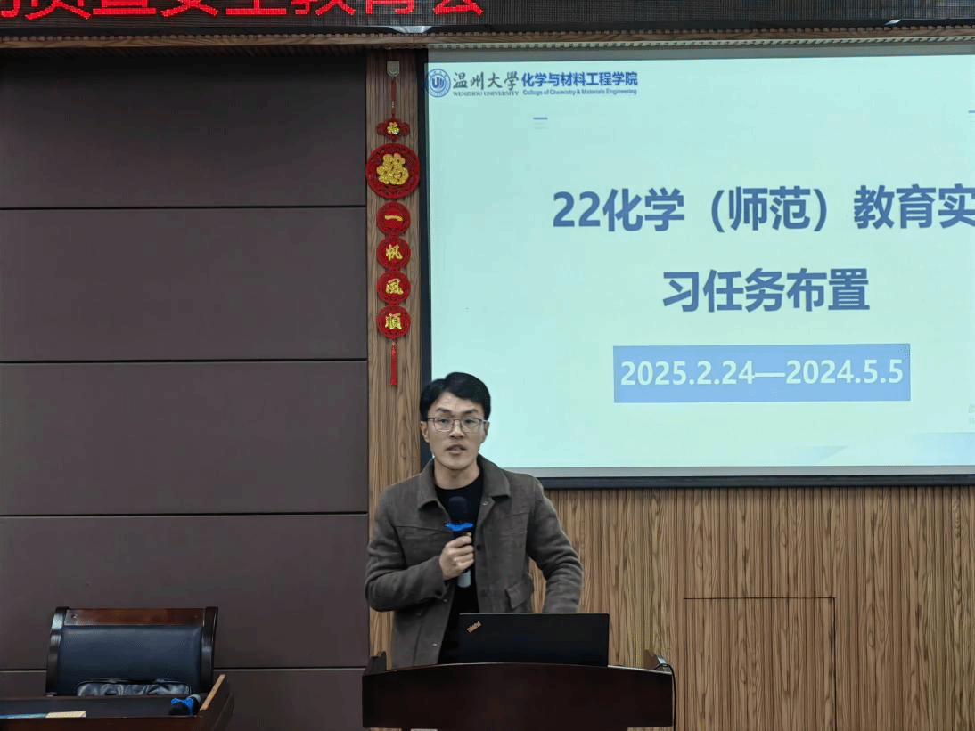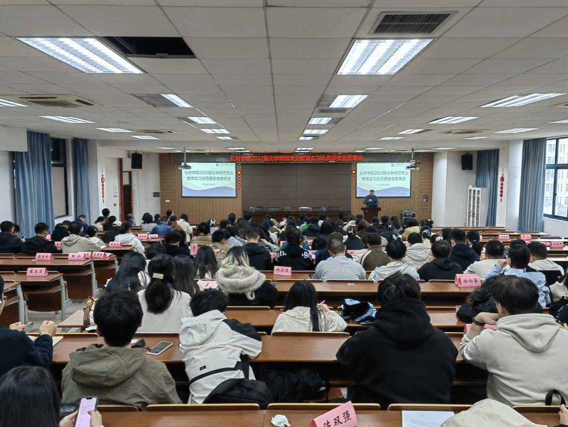 在11C-401教室召开2022级教育实习动员暨安全教育大会。副院长张礼杰、副书记王晓华、化学系主任方国勇以及陈迪妹、王嫁国、叶剑强等指导老师出席。会议由学工办主任邹涌彬主持。
