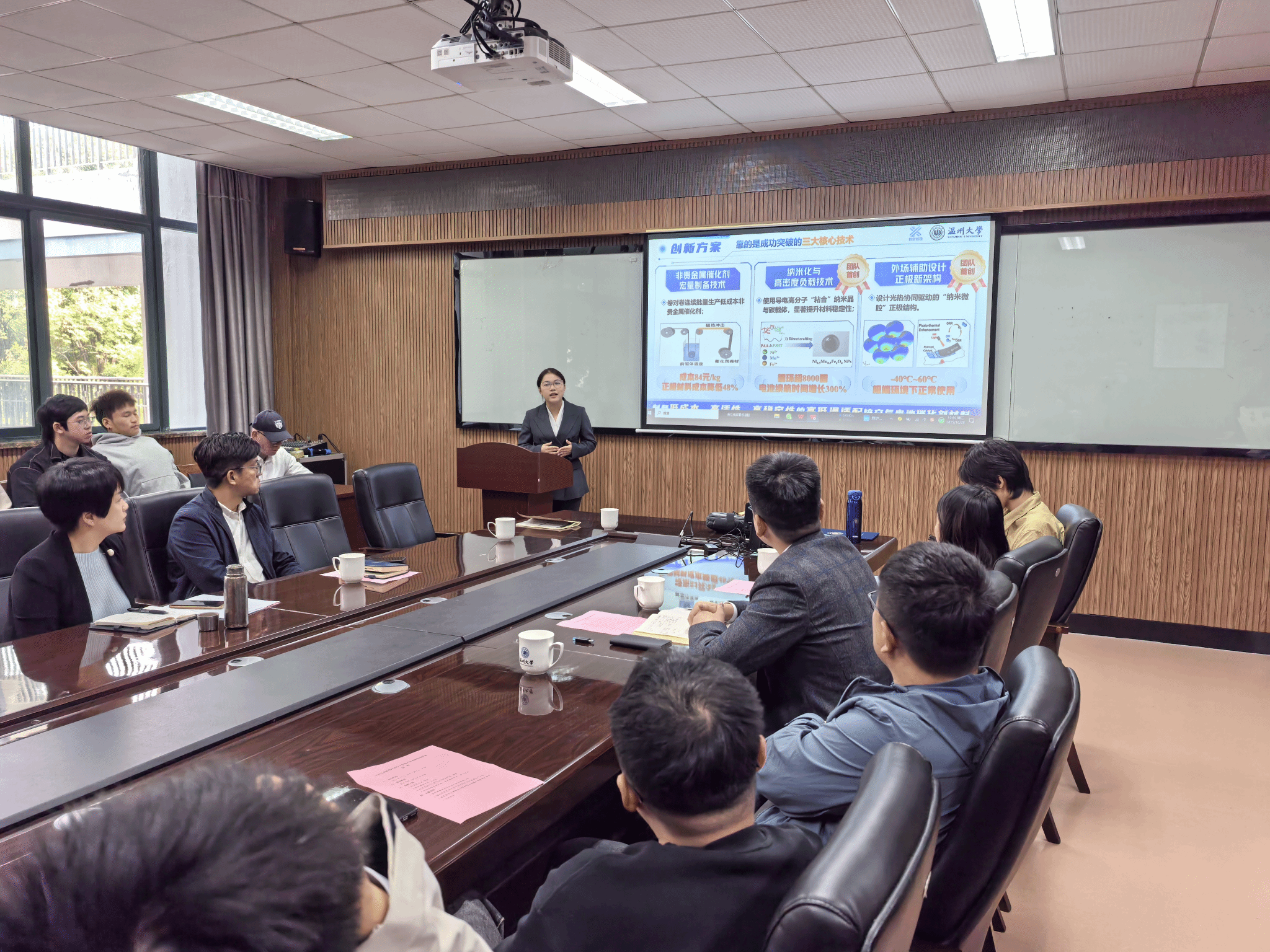 活动伊始,“挑战杯”国创赛银奖团队负责人学生吴世栎、陈木兰率先开展路演汇报,为下一届赛事的参赛人员提供优秀示范。汇报中,学生围绕参赛项目的背景意义、核心创新点、实践过程及成果转化潜力展开详细阐述,不仅展现了项目在技术突破、团队协作中的亮点,既体现了学科竞赛对学生创新能力、实践能力的锤炼,也为在场其他学生提供了可借鉴的备赛思路。